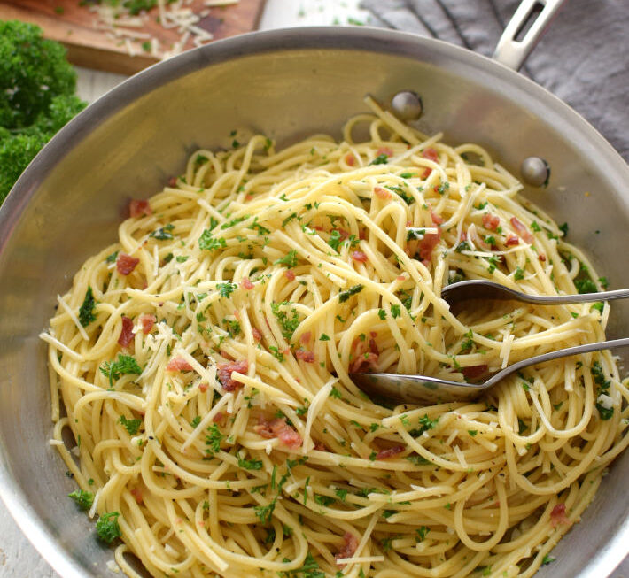 La historia de los espaguetis con ajo y perejil está arraigada en la tradición culinaria italiana, donde la simplicidad de los ingredientes destaca la calidad de la pasta y resalta los sabores naturales. Su popularidad y aprecio internacional son testamento de la belleza de la cocina italiana en su forma más sencilla y deliciosa. La popularidad de los espaguetis con ajo y perejil se ha extendido más allá de Italia debido a su sencillez y sabor delicioso. Esta receta ha encontrado su lugar en hogares y restaurantes de todo el mundo. La combinación de sabores simples y la facilidad de preparación hacen que los espaguetis aglio e olio sean un plato reconfortante y versátil que se disfruta en diversas ocasiones. Aquí tienes una receta sencilla y deliciosa de espaguetis con ajo y perejil, también conocida como «spaghetti aglio e olio»: