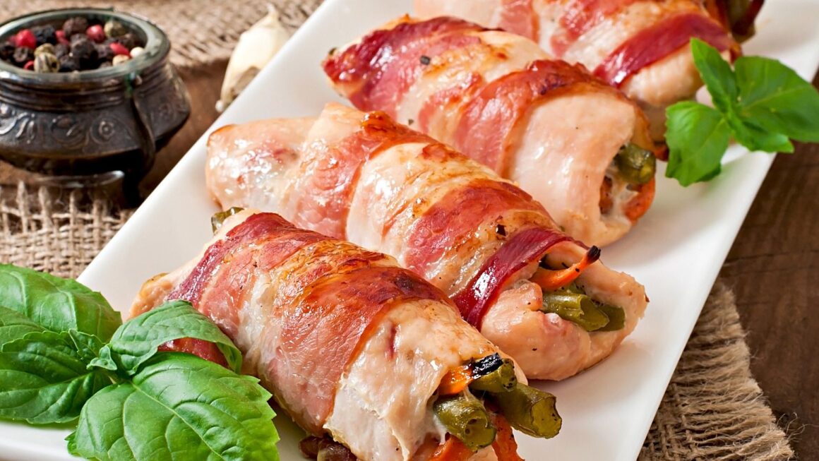 La receta específica de pollo relleno de verduras envuelto en tocino es una muestra de la creatividad en la cocina moderna. Los chefs y cocineros caseros buscan constantemente formas innovadoras de presentar ingredientes familiares y mejorar la experiencia gastronómica. Cada cocinero puede tener su propia variación de esta receta, experimentando con diferentes tipos de relleno, hierbas, especias y salsas para personalizar el plato según sus preferencias y el paladar de quienes lo disfrutarán. Este tipo de plato, con sus ingredientes ricos y sabores intensos, a menudo se asocia con ocasiones especiales y celebraciones. La combinación de ingredientes indulgentes hace que sea una opción popular para banquetes y festividades. Aquí tienes una deliciosa receta para preparar pollo relleno de verduras envuelto en tocino. Este plato es sabroso y jugoso, ¡perfecto para una comida especial!
