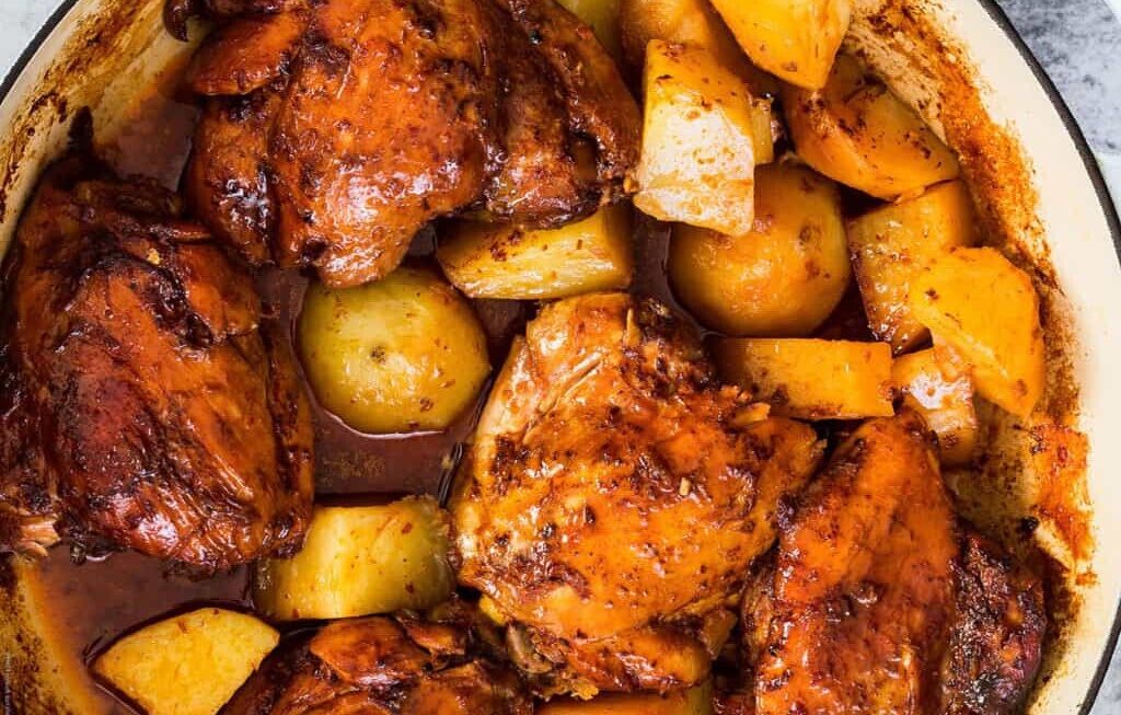 La combinación de pollo adobado con papas es parte de una tradición culinaria que ha evolucionado a lo largo del tiempo en diversas culturas. La práctica de adobar carnes tiene raíces antiguas y se encuentra en diversas culturas culinarias alrededor del mundo. La combinación de carnes, en este caso, pollo, con papas es popular en muchas culturas porque ofrece un plato sustancioso y equilibrado. Las papas complementan bien la carne al agregar textura y absorber los sabores del adobo. Los chefs modernos han llevado esta combinación a nuevos niveles mediante la introducción de variaciones creativas en los adobos y las preparaciones de papas, utilizando ingredientes frescos y técnicas contemporáneas. Aquí tienes una receta sencilla para preparar pollo adobado con papas. Este plato es sabroso y reconfortante, perfecto para una comida completa.