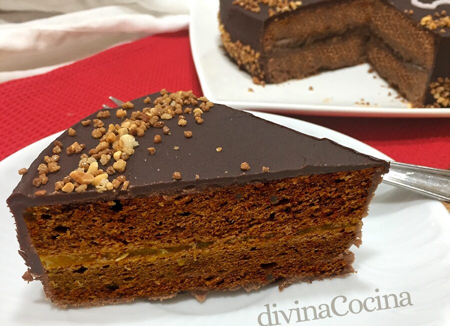 - Dejamos enfriar el bizcocho y desmoldamos. Cortamos por la mitad y rellenamos la tarta sacher con la mermelada de albaricoque.
