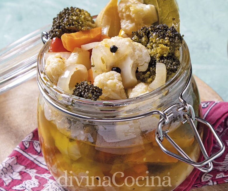 - Retiramos del fuego y llevamos a un recipiente con tapa. Hay que procurar que las verduras queden bien cubiertas por el escabeche.