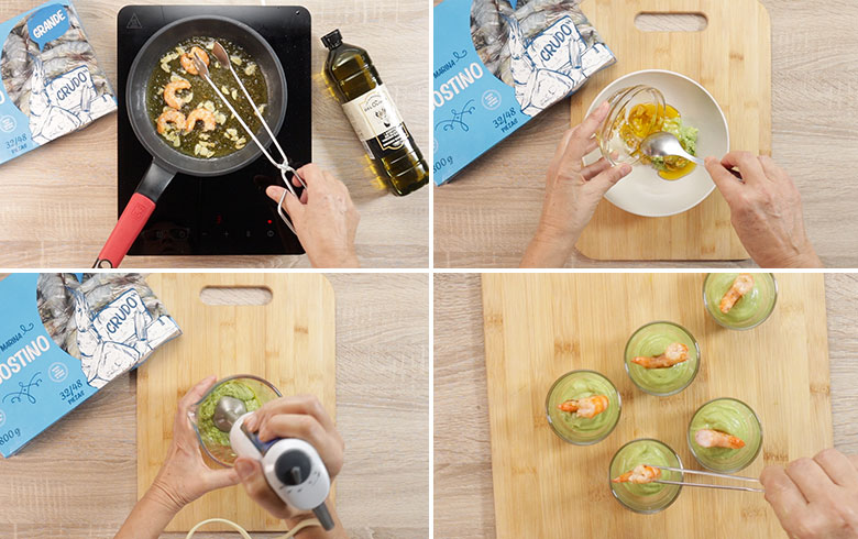 - Montamos el aperitivo en una rebanada de pan tostado o en un vasito de aperitivo, poniendo en la base la crema de aguacate y decorando con un par de colas de langostinos salteados. Si lo preparas en chupitos, acompaña con una cucharilla de postre.