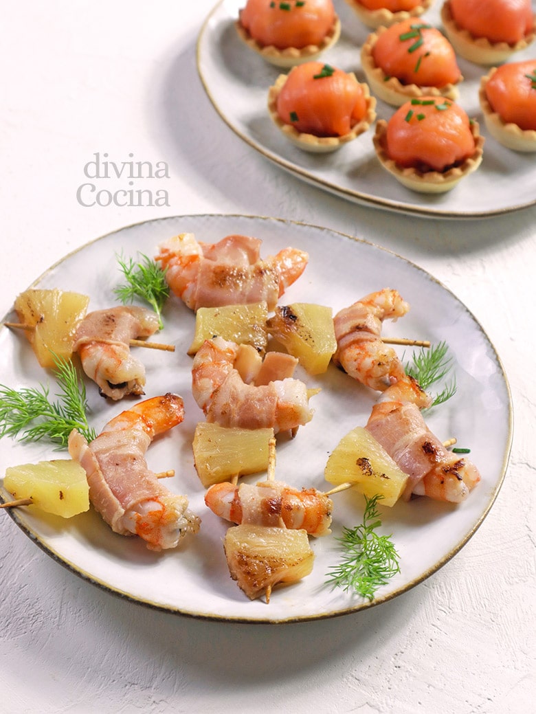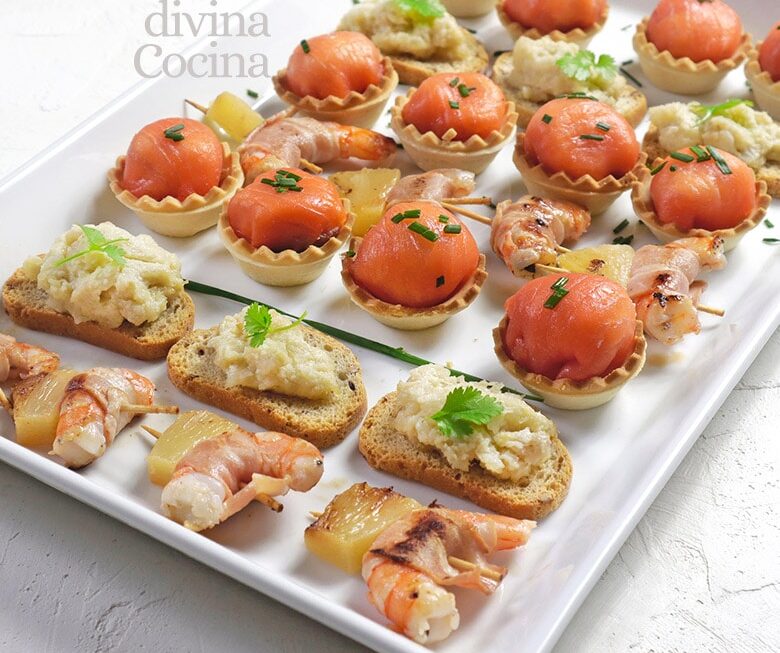Si tienes invitados en casa, preparar estos aperitivos fáciles no te va a llevar mucho tiempo y seguro que triunfas. Preséntalos por separado y los vas sacando por tiempos, o todos juntos en una bandeja. Si quieres puedes sacar el langostino al final y servirlo templado o caliente.