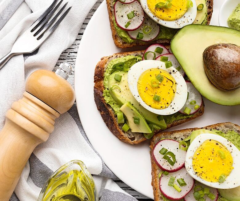 Tuesta el pan y rocía con un hilo de aceite de oliva. Unta el aguacate machacado en las tostadas o córtalo en láminas y cubres las tostadas con ellas. Agrega los huevos cocidos y sazona con pimienta y sal. Opcionalmente puedes añadir rabanito en rodajas y cebollino picado para dar un punto crunchy y aportar más fibra vegetal. El aguacate proporciona grasas saludables y los huevos son una excelente fuente de proteínas.