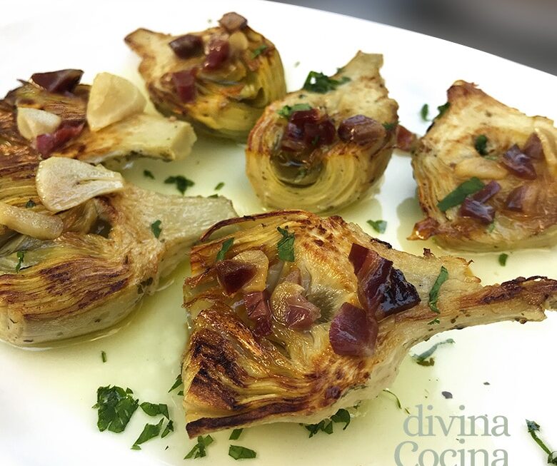 • Podemos servir estas alcachofas a la plancha con un mojo de ajo y perejil con aceite de oliva virgen extra o simplemente con un hilo de aceite de oliva y unas gotas de limón. También podemos añadir por encima una fritada de ajos en aceite de oliva.