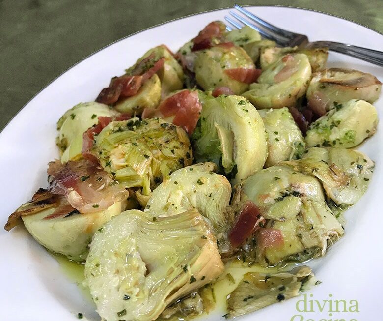 5. Servimos las alcachofas salteadas con jamón al momento, recién hechas, espolvoreadas de perejil picado.