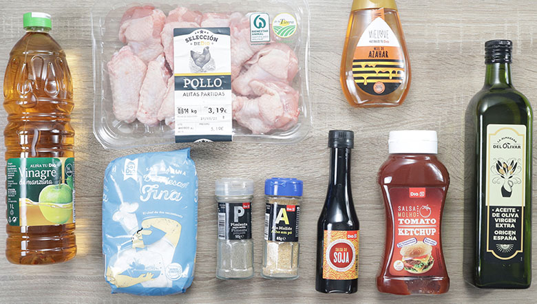- 12 alitas de pollo enteras y cortadas en dos (desechamos las partes de la punta)