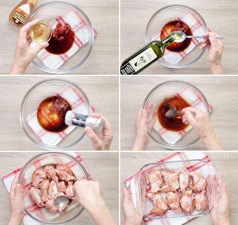 - Mezclar bien la soja, el ketchup, la miel, el aceite y el vinagre. Salar las alitas (con cuidado porque la soja ya sala mucho) y espolvorear con la pimienta y el ajo en polvo. Embadurnar con la salsa.