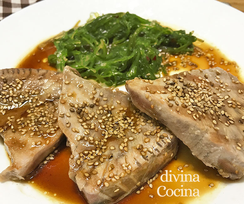 - Una vez ligada la salsa, rociamos con ella los filetes de atún y servimos al momento. Si te sobra algo de atún en salsa de soja (que no creemos), pruébalo en frío, está también delicioso.