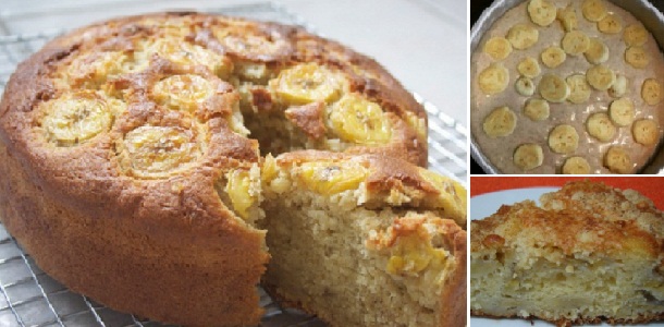 Vertemos la masa del bizcocho en un molde untado con mantequilla, tratando de que quede bien nivelado, es decir, que la mezcla quede repartida por igual en todo molde, y lo adornamos con las rodajas de plátano que habíamos reservado. Lo metemos al horno, que deberá estar precalentado a 180°C con calor arriba y abajo. Lo dejamos entre 45min y 1 hora y cuarto (todo dependerá de nuestro horno).