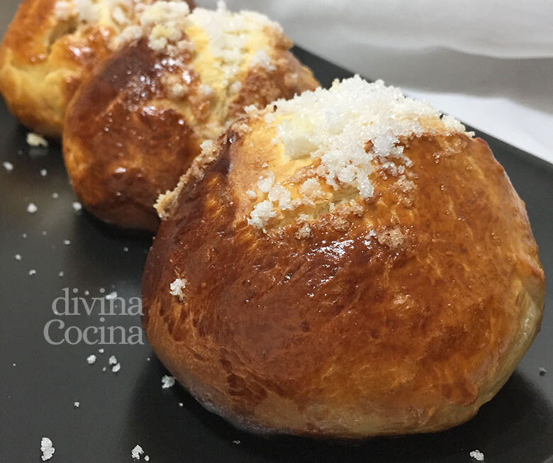 - Decoramos los bollos suizos o bollos de leche con el azúcar perlado y metemos al horno unos 15 minutos, hasta que estén bien dorados.