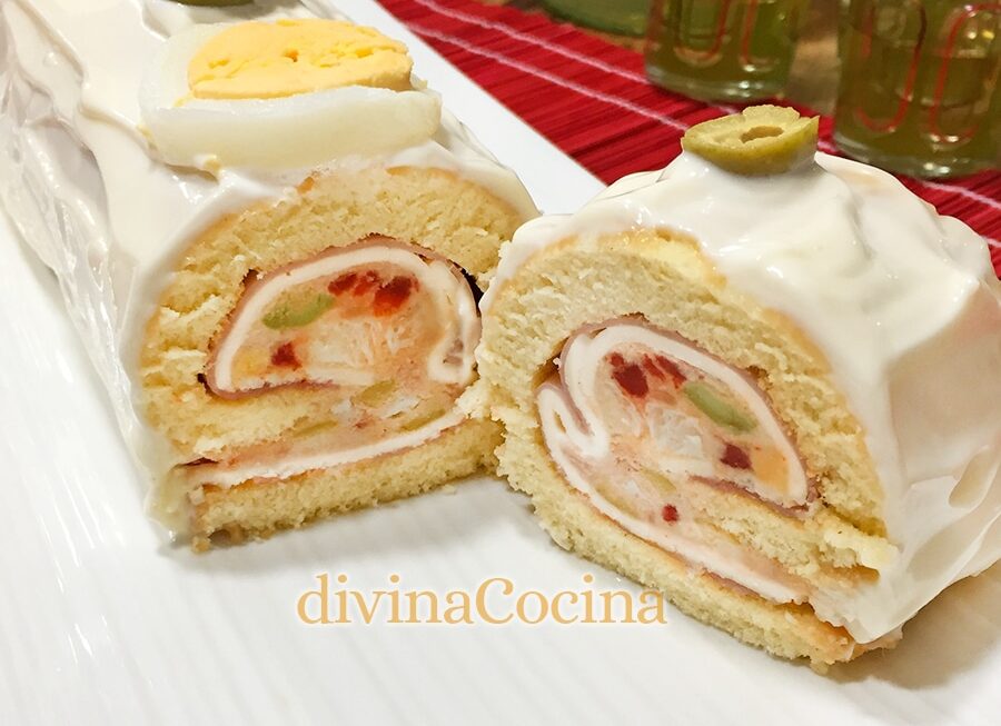 Recuerda que hay que evitar siempre los rellenos muy húmedos (lechuga, tomate…) porque estropean el bizcocho. Si usas ingredientes vegetales como pimientos de lata, aceitunas… tienes que sacarlos muy bien con un trapo limpio. Evita también las salsas demasiado líquidas. Usa una mayonesa más bien espesa para recubrir el brazo de gitano salado.