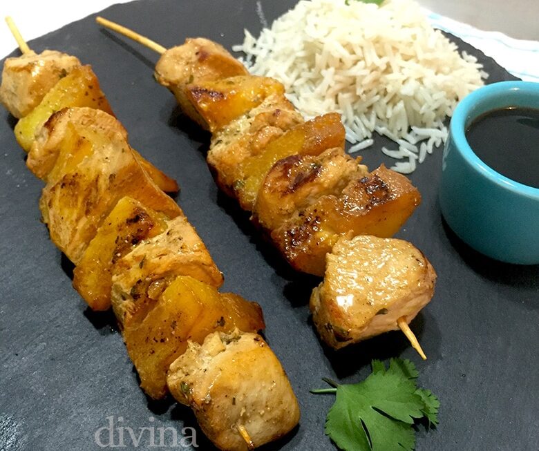 Esta receta de brochetas de pollo y piña marinadas es facilísima de preparar, con ingredientes comunes y muy sencillo, pero con un toque exótico y especial.