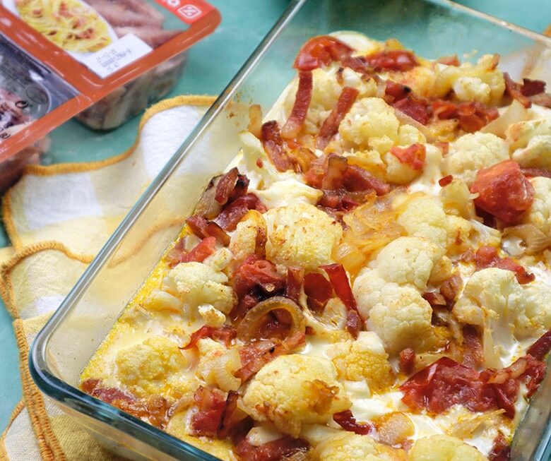 3. En una sartén, rehogamos en aceite la cebolla laminada fina y el tomate pelado y también en rodajas. Salpimentamos y dejamos reducir. Cuando esté bien pochado añadimos el bacon y dejamos un par de minutos más. Lo ponemos todo sobre la coliflor en una bandeja de horno y mezclamos un poco con cuidado para que no se nos desmorone.