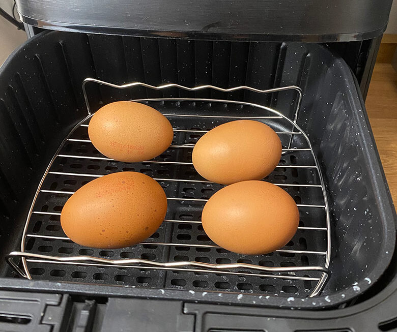 Para una yema líquida, precalienta la freidora a 120 °C) y cocine los huevos entre 4-6 minutos según tus gustos.