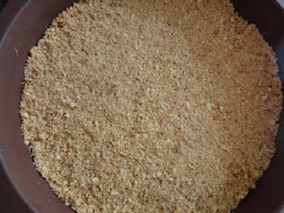 *Fundimos la mantequilla y la mezclamos con las galletas, y extendemos esta masa por la base del molde que vayamos a utilizar. Puedes también cubrir los laterales del molde, a tu gusto. Y reservamos en la nevera mientras preparamos el resto. Hay quien hornea unos minutos esta base de galleta, pero yo prefiero hornearlo todo junto (al hornearla quedará más crocante).