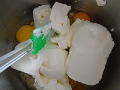 *Mezclaremos primero el queso con los huevos, y ahora no batiremos con las varillas como otras veces (como en un bizcocho). Como queremos evitar las burbujas, lo que haremos será mezclar con una cuchara o espátula hasta que quede una mezcla homogénea (si utilizas un robot, prueba con el recambio amasador).