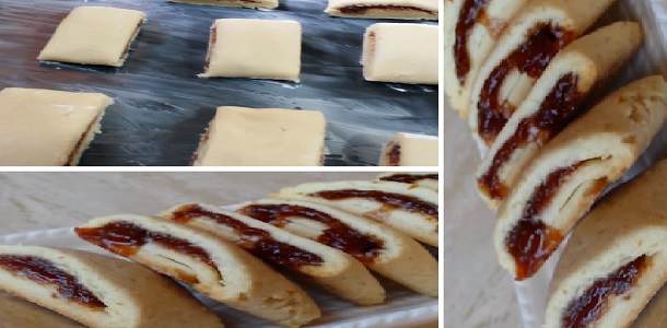 Poner las tiras de masa a una hoja de papel de horno. Cortar la masa en porciones de un bocado (antes de la cocción). Hornea las galletas newtons en el horno a 150 grados durante 12-15 minutos, hasta que se inflen y se doren por los bordes.