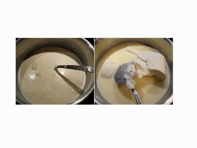 1. Pon a calentar la nata con el azúcar, a fuego medio y añade el queso. Remueve constantemente hasta que se disuelva en la nata.