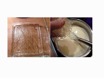 2. Hidrata las hojas de gelatina en un recipiente con un poquito de agua fría. Espera unos cinco minutos y luego escúrrelas del agua e incorpóralas a la nata con queso. Remueve hasta que se disuelvan por completo y retira del fuego.