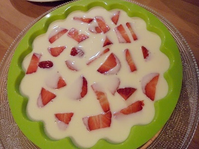3. Pon la mezcla en un molde de silicona y reparte las fresas troceadas. Mete en la nevera por lo menos tres horas, aunque mejor si lo puedes dejar hasta el día siguiente.
