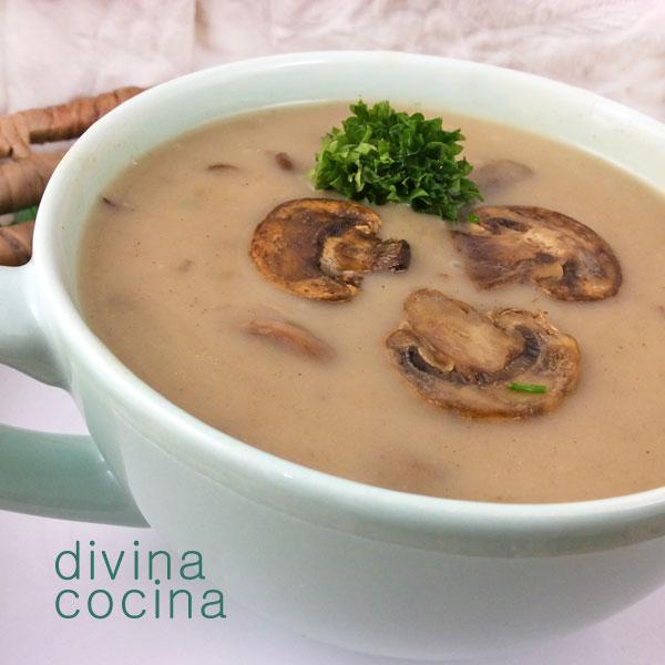 - Damos un hervor y pasamos por la batidora hasta que resulte una mezcla cremosa y homogénea. Decoramos con los champiñones reservados, mezclamos y servimos caliente.
