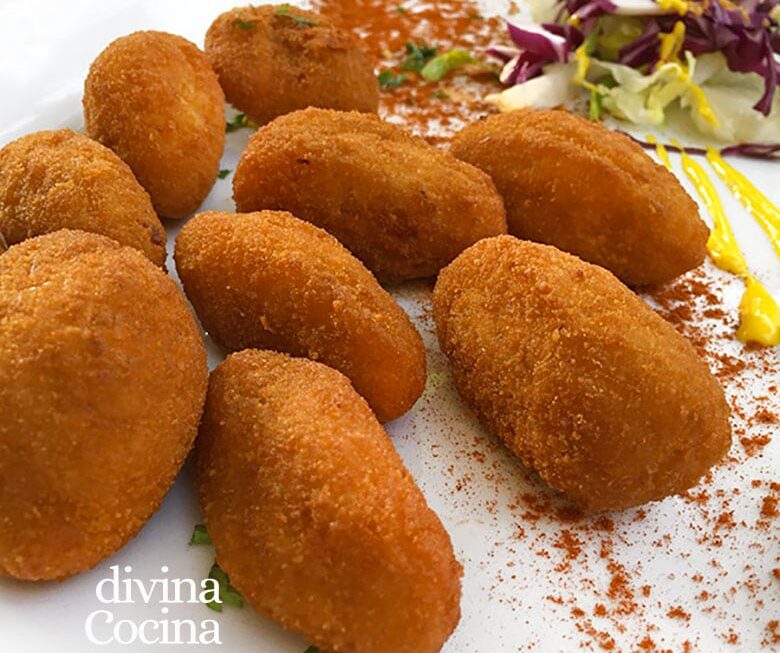 • Para que las croquetas no se abran al freírse tienes que asegurarte de que la masa está lo suficientemente consistente. El aceite debe estar caliente y empezar a humear, pero nunca a temperatura extrema porque la diferencia de temperatura al freír también puede romperlas. Si el aceite no tiene la temperatura adecuada y está demasiado frío también suelen abrirse.