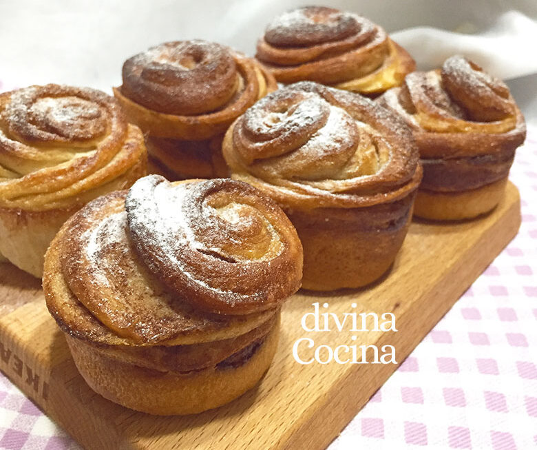Nosotros lo hemos rellenado de crema de cacao, pero se pueden hacer sis relleno poniendo simplemente un poco de azúcar moreno. Están deliciosos también con el relleno a base de azúcar y canela que llevan los Cinnamon Rolls o Rollitos de Canela (aquí puedes ver la receta).