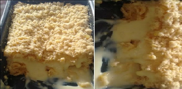 Untar la forma con margarina, colocar la masa en el fondo y luego colocar la crema y cubrir con la masa. Así llevar al horno en 200 ° por 35 min. ¡Y estará lista!