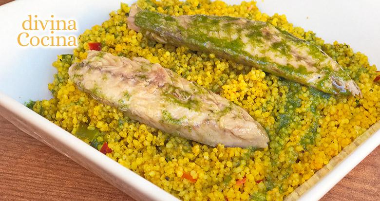 - Para servir pasamos por la batidora un buen chorro de aceite con perejil fresco. Ponemos de base el cuscús, por encima el pescado (si usas atún procura que sean unos lomos de melva, o unas lascas de ventresca) y salseamos con el aceite de perejil. Se sirve frío.