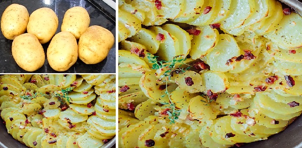 Picamos el tocino y lo esparcimos cobre las papas. Sazonamos con sal y pimienta al gusto. Vaciamos entonces la mezcla de mantequilla y cebolla sobre las papas en el molde de tal manera que estén bien recubiertas. Esparcimos finalmente el tomillo seco y ponemos en horno caliente a 200ºC por unos 25 minutos.