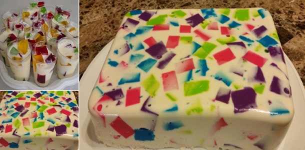 Deja reposar y lleva la gelatina multicolor al refrigerador hasta que queda bien firme.