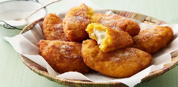 - Ahora, paraformar las empanadas de plátano, humedece ligeramente las manos y forma bolas con la masa. Aplasta bien cada bola y coloca en el centro una porción de queso rallado. Luego cierra formando una media luna y sella los bordes con un tenedor.