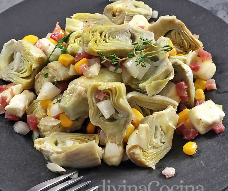 Esta ensalada de alcachofas con jamón y queso es facilísima de preparar, con ingredientes muy sencillos. Es ligera, sabrosa y muy original.