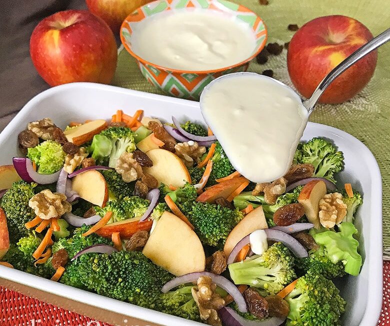 Con esta ensalada de brócoli, manzana y nueces preparas en pocos minutos una ensalada de verduras, crujientes y sabrosas, con un aderezo de yogur que la convierte en un plato completo y lleno de sabor.