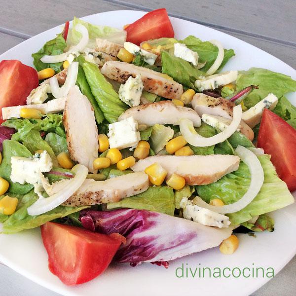 Esta ensalada de pollo y queso azul es muy completa y consistente, perfecta para plato único en una cena rápida.