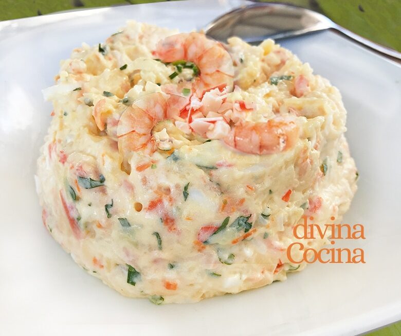 Esta ensaladilla de langostinos y cangrejo es un plato sencillo y de fiesta, tiene mucho sabor a marisco y la receta es muy sencilla.