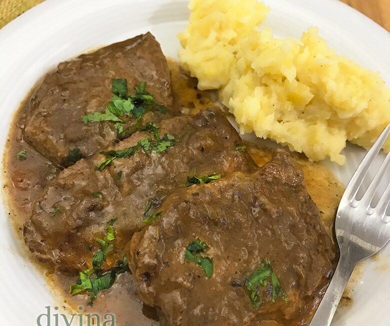 Servimos la carne cubierta con la salsa y espolvoreada con el perejil picado.