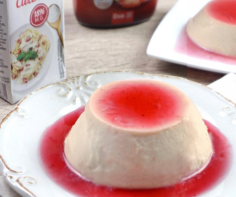 - Ya solo nos queda poner el sirope de fresa en los moldes y añadir la mezcla en cada uno. Los llevamos a la nevera y en unas horas ya podremos disfrutar de nuestro flan de té frío fresco y natural.