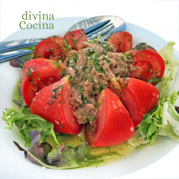 Otra idea para aderezar esta flor de tomate aliñado es poner sobre el relleno un poco de salsa pesto.