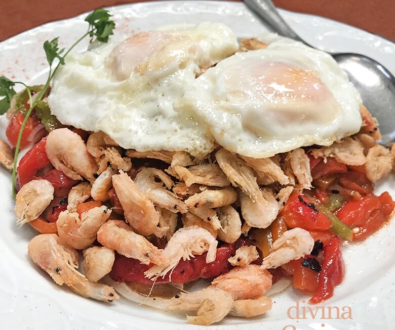 Nos ha conquistado la propuesta para gambas o camarones fritos de Tradevo (Sevilla). Ponen a freír en el aceite, junto a los camarones o gambas y también enharinadas, unas tiras finas de cebolla y pimiento rojo que dan mucho frescor al plato, y al mismo tiempo un punto crujiente. El plato es similar a los calamares del campo (puedes ver la receta aquí). El tiempo de fritura es tan corto que la verdura queda al dente, perfecta!! Lo sirven con un par de huevos fritos para rematar la faena. A la hora de comer, los huevos se trocean y se mezclan con la fritura.