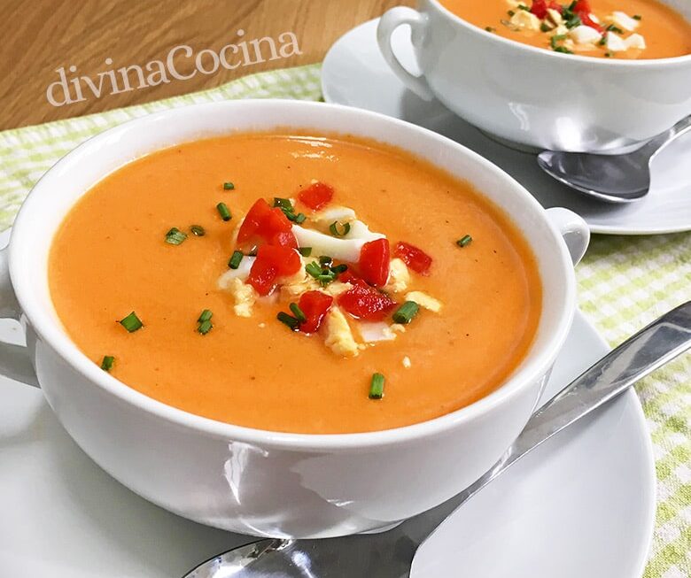 - Lo dejamos enfriar en la nevera unas horas y servimos con huevo duro picado, unas lascas de ventresca de bonito, un poco de cebolleta o cebollino picado, taquitos de jamón… a tu gusto. También lo podemos servir en vasos o chupitos para beberlo o servirlo como aperitivo.