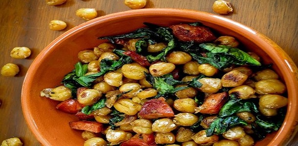 Cozinhe o grão-de-bico na água com o louro e o sal, na panela de pressão, por 1 hora. A parte, em uma frigideira grande, frite o bacon no óleo, junte a cebola, depois a carne e, por último, o paio e a linguiça. Deixe refogar bem, acrescente os tomates e junte o grão-de-bico, com a cenoura. Deixe terminar o cozimento. Finalize com a salda. Sirva quente com arroz.