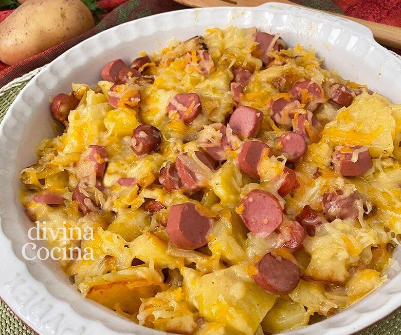 INGREDIENTES del gratén de patatas con salchichas para 6 raciones