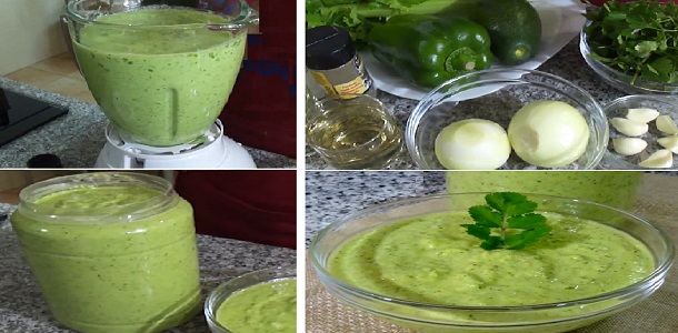 Retire la concha del aguacate y la semilla, pique en trozos, coloque en una licuadora, junto con la cebolla, el pimentón y el ajo, coloque las hojas de cilantro, apio españa, ajo porro y licue, agregue poco a poco aceite y vinagre hasta formar una crema ligera, salpimiente al gusto.