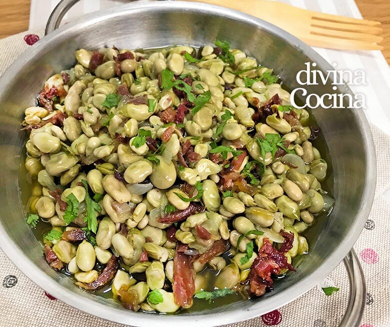 Se puede suprimir la cebolla y freír únicamente las habas con el jamón.