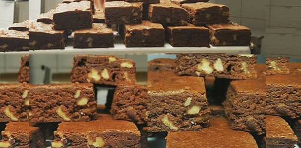 Tamizar la harina con el cacao y unir al batido junto con el chocolate fundido y tibio. Finalmente unir las nueces picadas groseramente