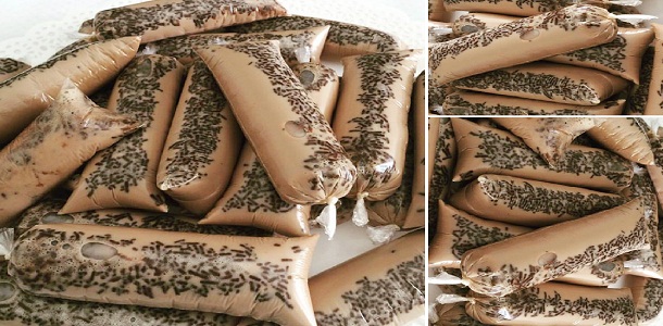 LA continuación Agregar 1 cucharada de granules de chocolate en cada bolsita de heladito. Despues vierta el líquido de la licuadora en las bolsitas. No olvide dejar un espacio vacío para atar y cerrar el helado.