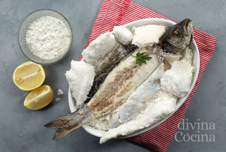 - En cuanto el pescado esté a punto lo retiramos del horno y rompemos la costra de sal al momento, para que el pescado no absorba sal en exceso. Este detalle es MUY IMPORTANTE y nos puede estropear el resultado.
