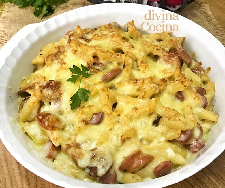 Si quieres un plato más consistente de macarrones con salchichas puedes añadir también por encima de los macarrones unas cucharadas de salsa bechamel y después espolvorear con el queso para gratinar.
